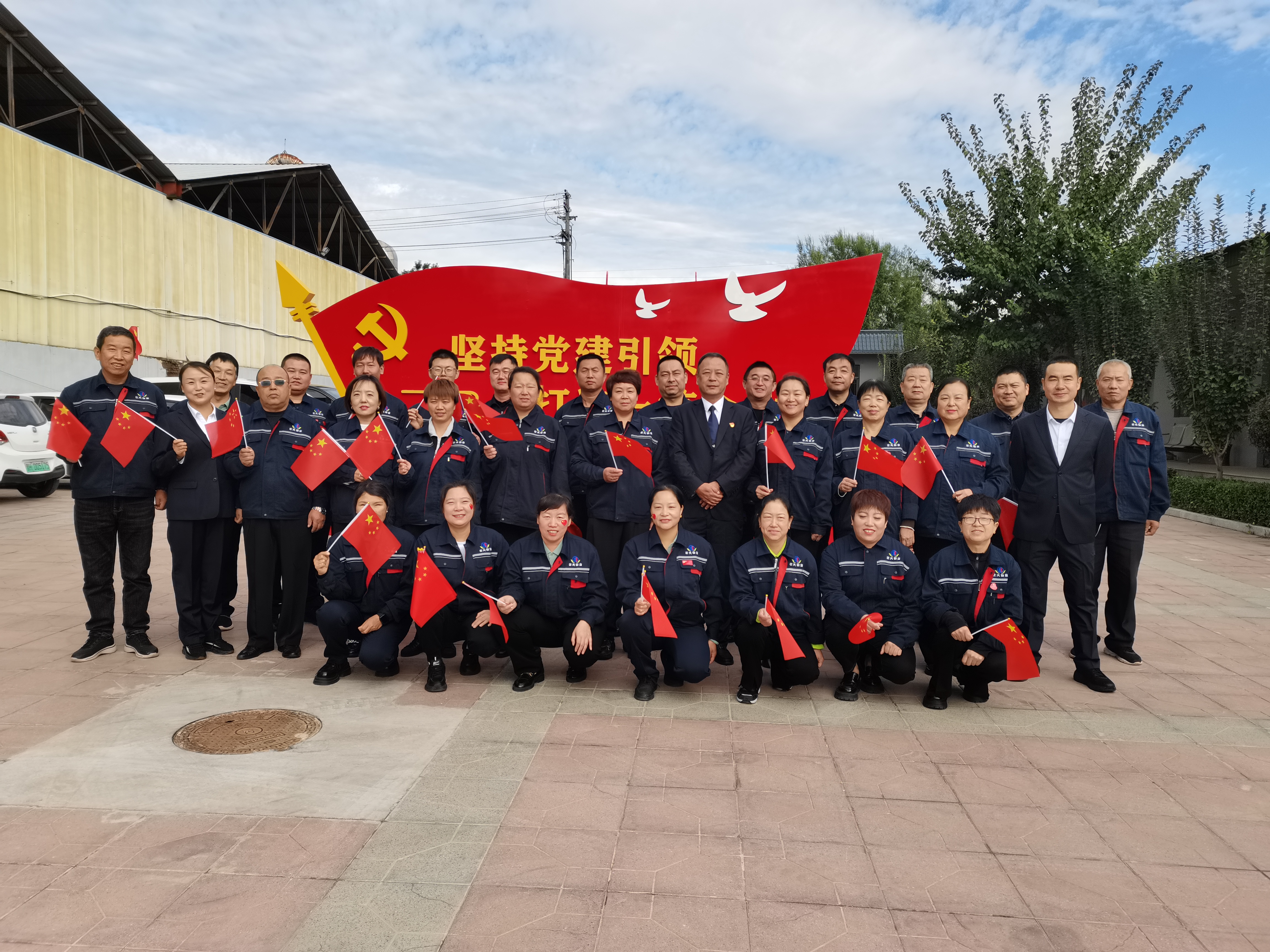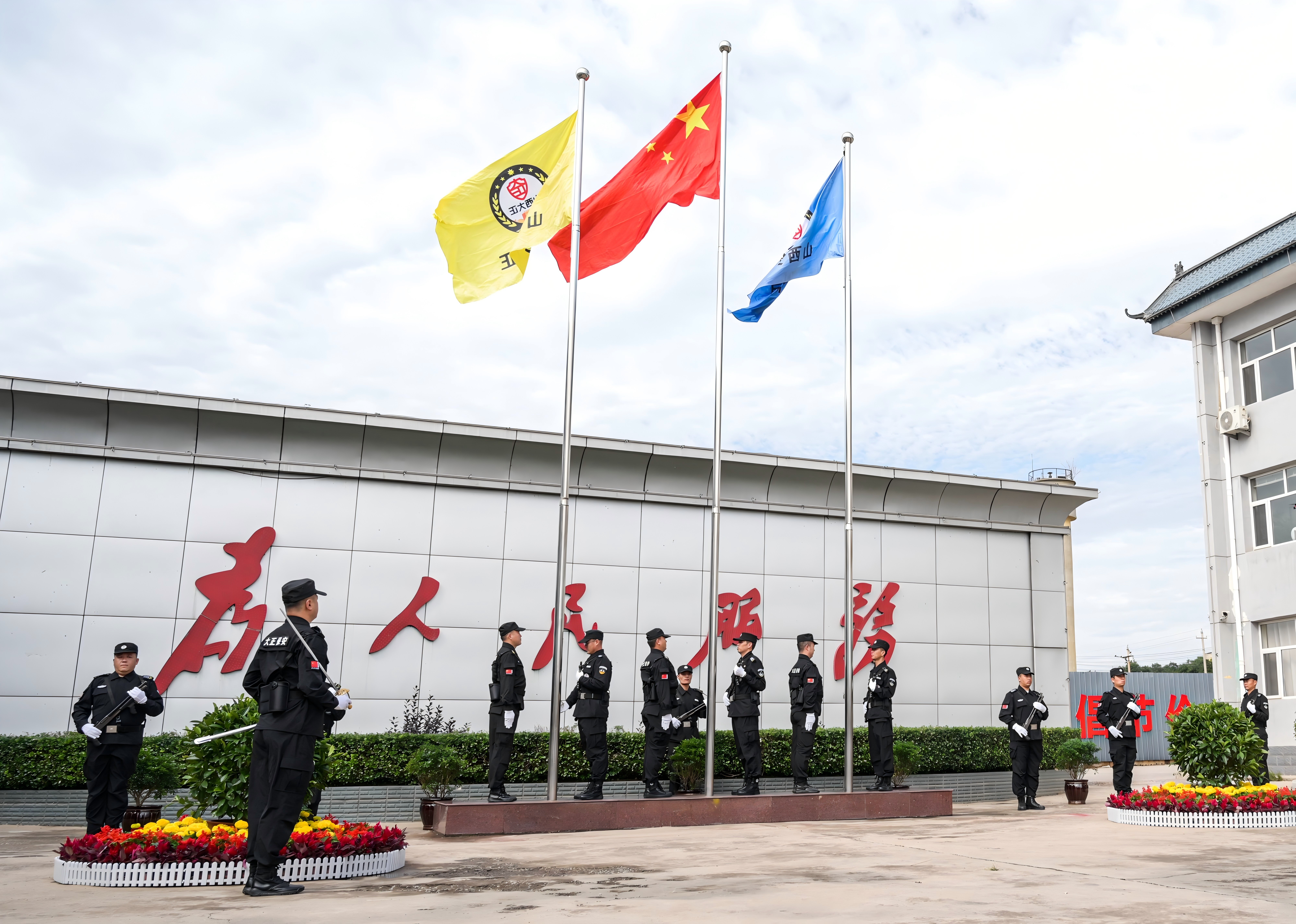 節(jié)日的公司院內(nèi)外,四周花團(tuán)錦簇,大門口燈籠高掛、彩旗飄揚(yáng),為節(jié)日增添了濃厚的喜慶氛圍。公司運(yùn)鈔車、巡邏車、運(yùn)兵車干凈整潔,排列在場地兩側(cè),升旗儀式更顯隆重。9時(shí)30分,集團(tuán)公司、各子公司領(lǐng)導(dǎo)和機(jī)關(guān)各部門、城區(qū)員工共300多人整齊列隊(duì),懷著激動(dòng)的心情,手持小國旗,臉上貼著愛國貼紙、洋溢幸福的笑容,眼神中充滿了對祖國的熱愛和對升旗儀式的期待。