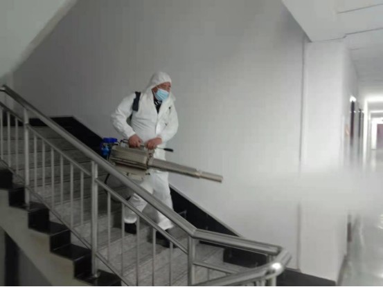會后億通公司立即與藍(lán)天救援隊聯(lián)系,采用彌霧器等專用消毒設(shè)備,利用下班時間人員不在辦公場所時間,為兄弟單位、食堂進行了全覆蓋、無死角、高強度的全面消毒。