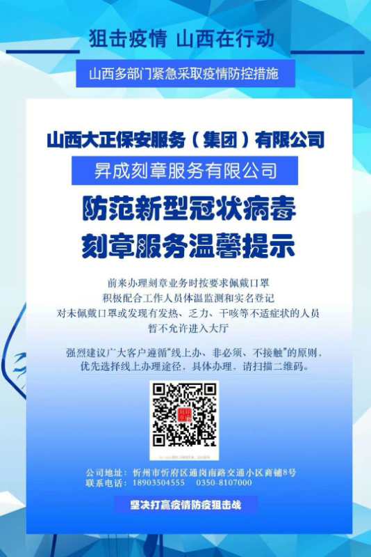 山西大正昇成刻章服務(wù)有限公司將繼續(xù)響應(yīng)集團(tuán)公司號召,在疫情期間嚴(yán)格落實(shí)各項(xiàng)規(guī)章制度,并通過線下線上齊發(fā)力的方式迎來業(yè)務(wù)加速拓展。